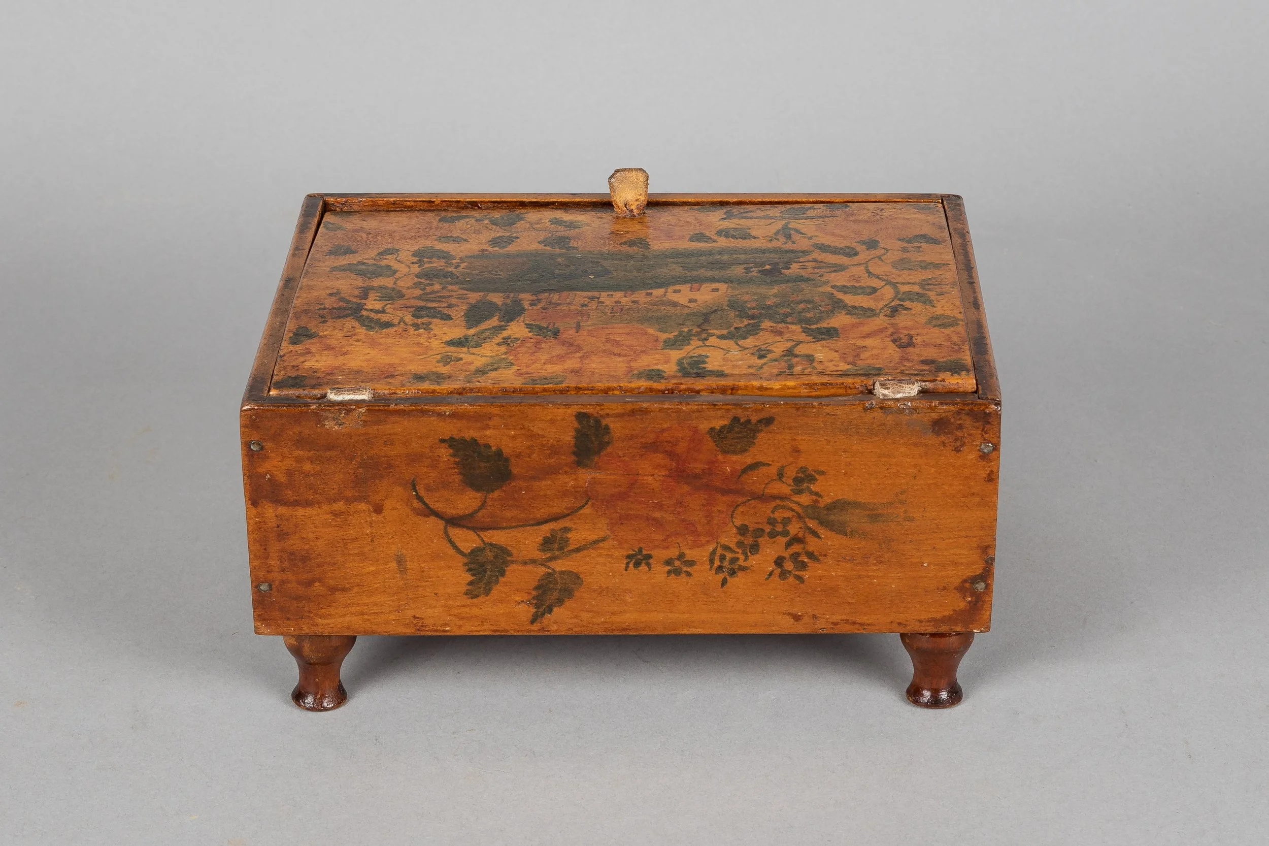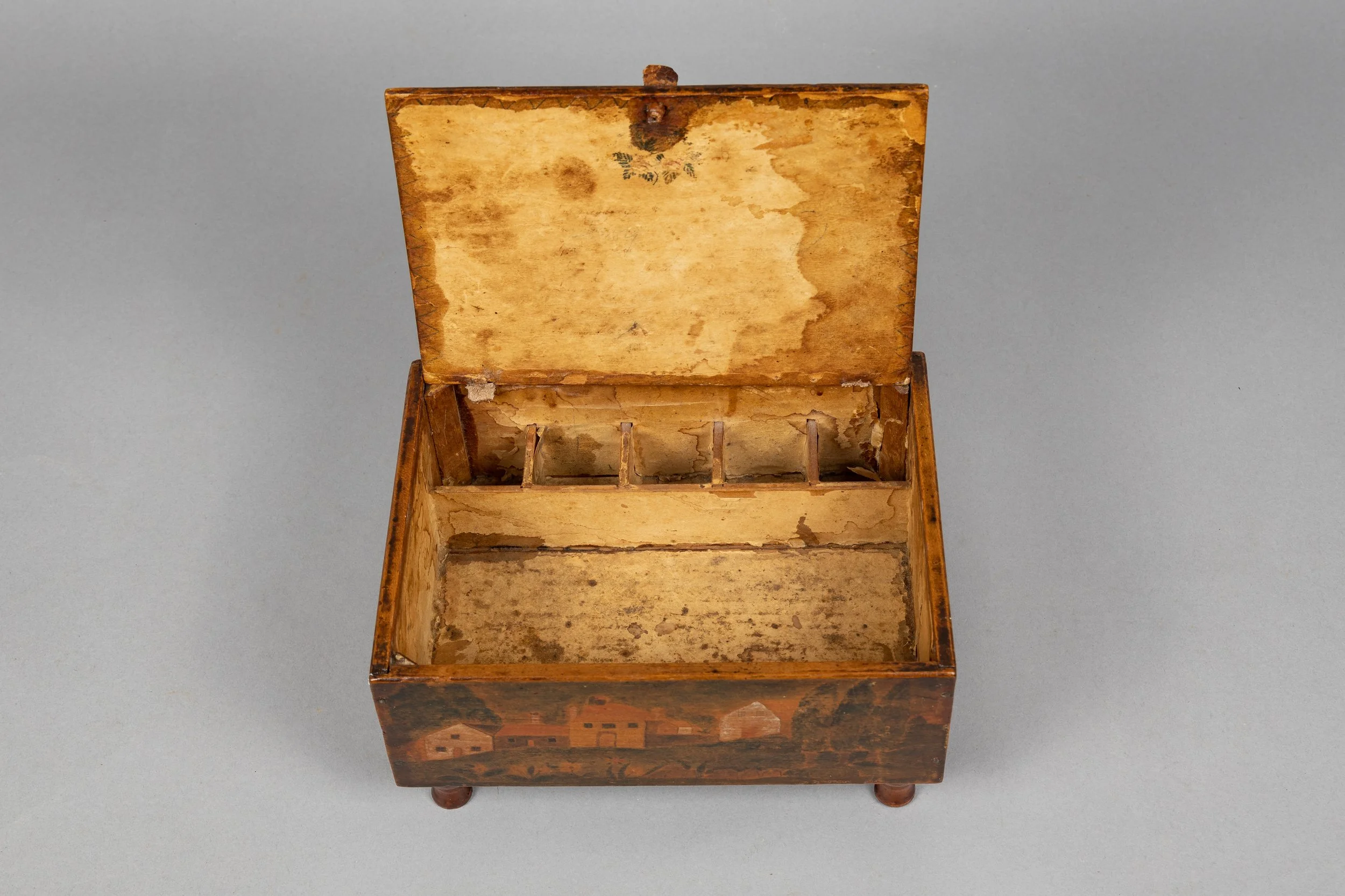 For those who love New England architecture—a charming watercolor schoolgirl box of unusual form and design. Said to have come from a house in St. Johnsbury, Vermont, this box is on original turned feet, and has a compartmentalized interior.