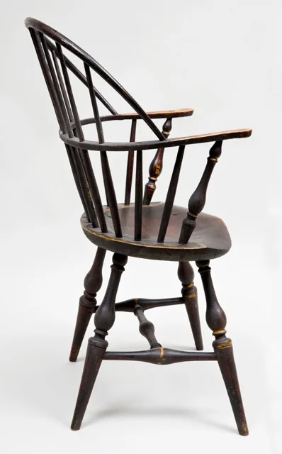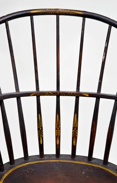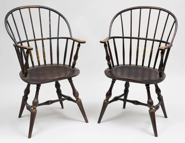 An unusually stylish pair of New England paint-decorated sack-back Windsor armchairs in untouched condition.