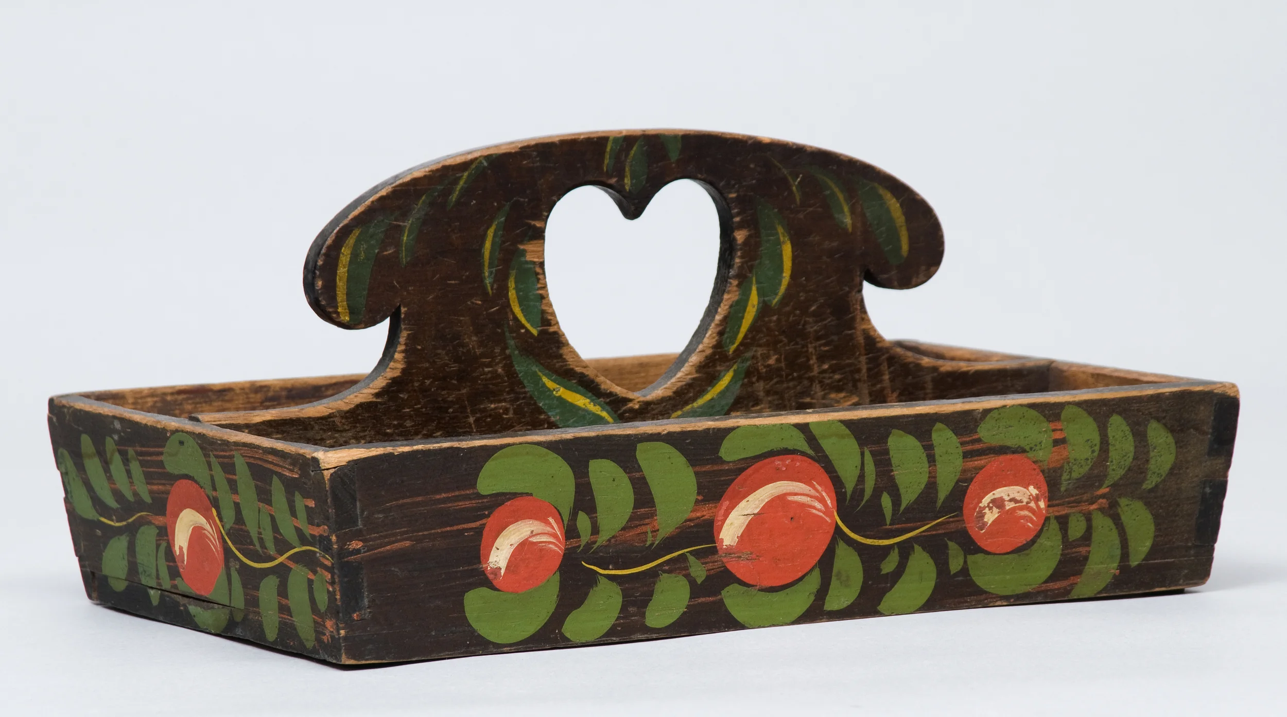 PAINT-DECORATED CUTLERY BOX WITH HEART CUTOUT HANDLE