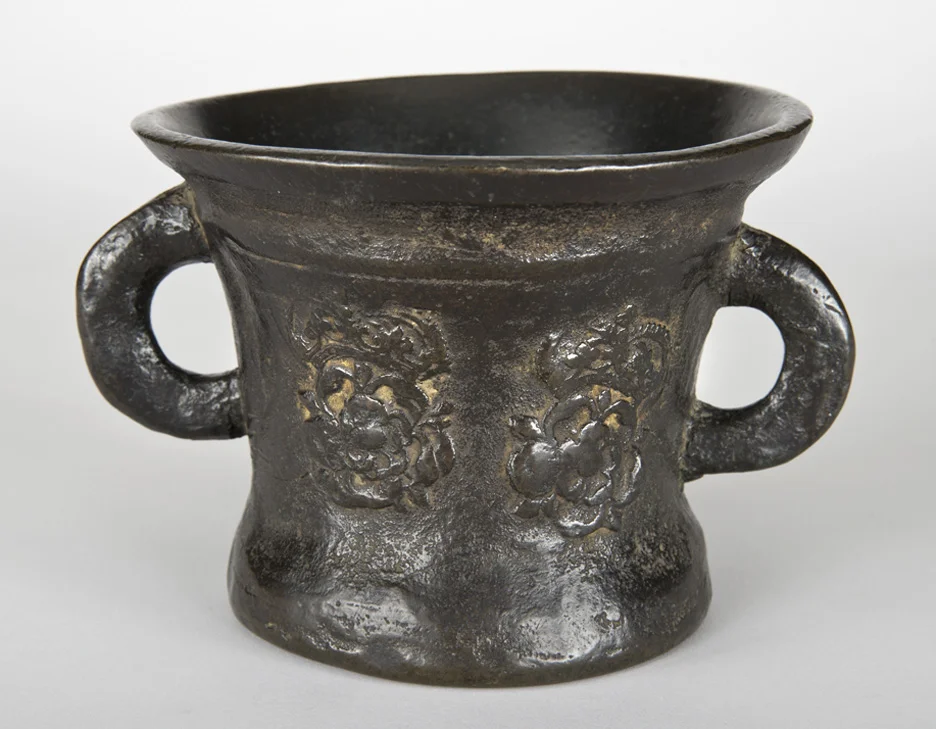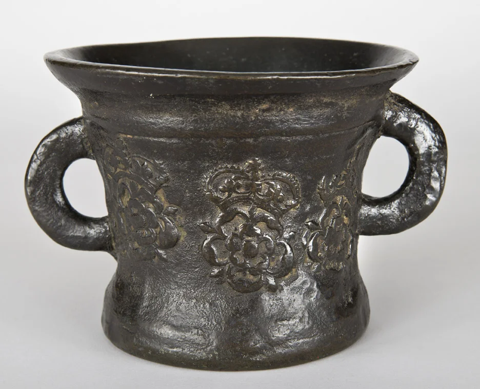 A 17th c. English bronze mortar with crowned Tudor roses on each side.